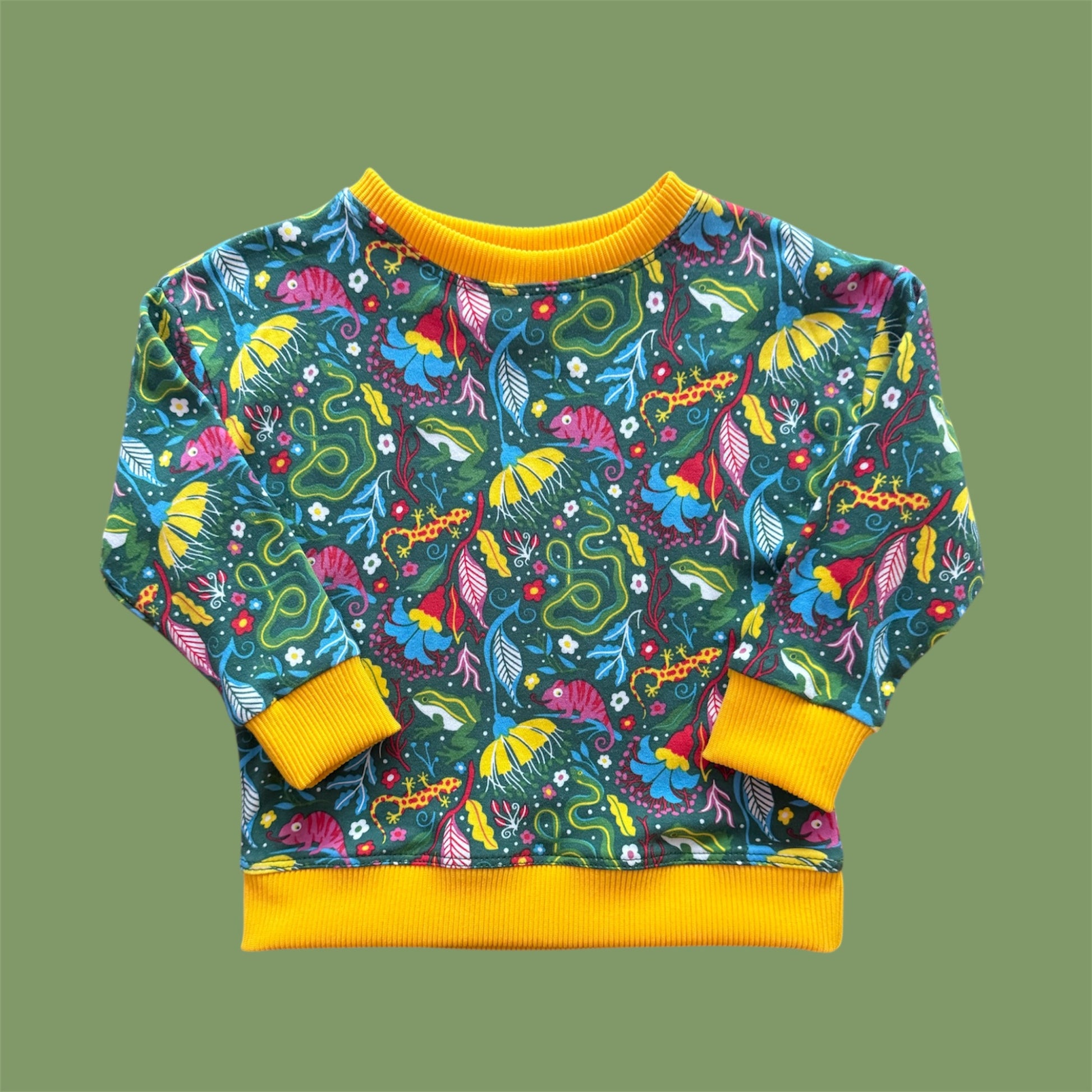 Introducing the Jungle Forest Cotton Original Crewneck Sweatshirt! Made from super soft cotton, this sweatshirt features a playful jungle design with chameleons, frogs, and other fun creatures. Perfect for every child who loves exploring and having fun!