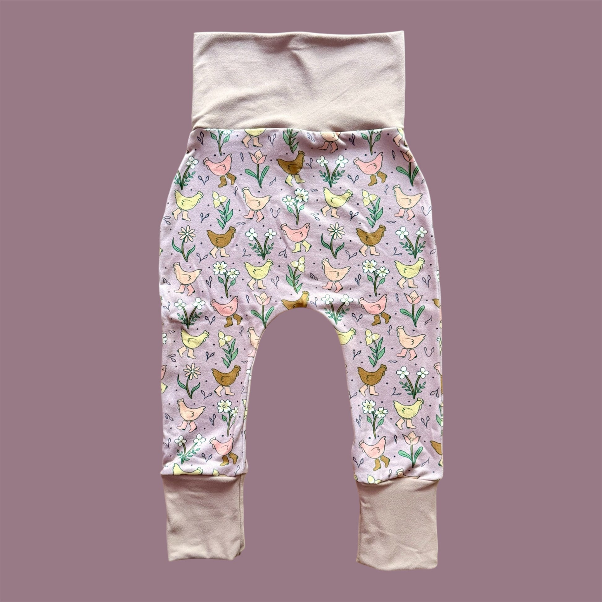 Pants that are made to grow with your child. No more having to constantly switch out pants when your little one has a growth spurt. With our grow with me pants all you have to do is roll up and down the waist band and cuffs. We offer four sizes. Our first is meant for the newborns in our life, 0-6 months. I recommend this size if you know you have babies on the slim side. Our next is for 3m-12m, these pants fit once they get out of the newborn stage and all the way up to 12 months. Then we have the 12m-3T and 3T-5T for the growing toddlers in your life.