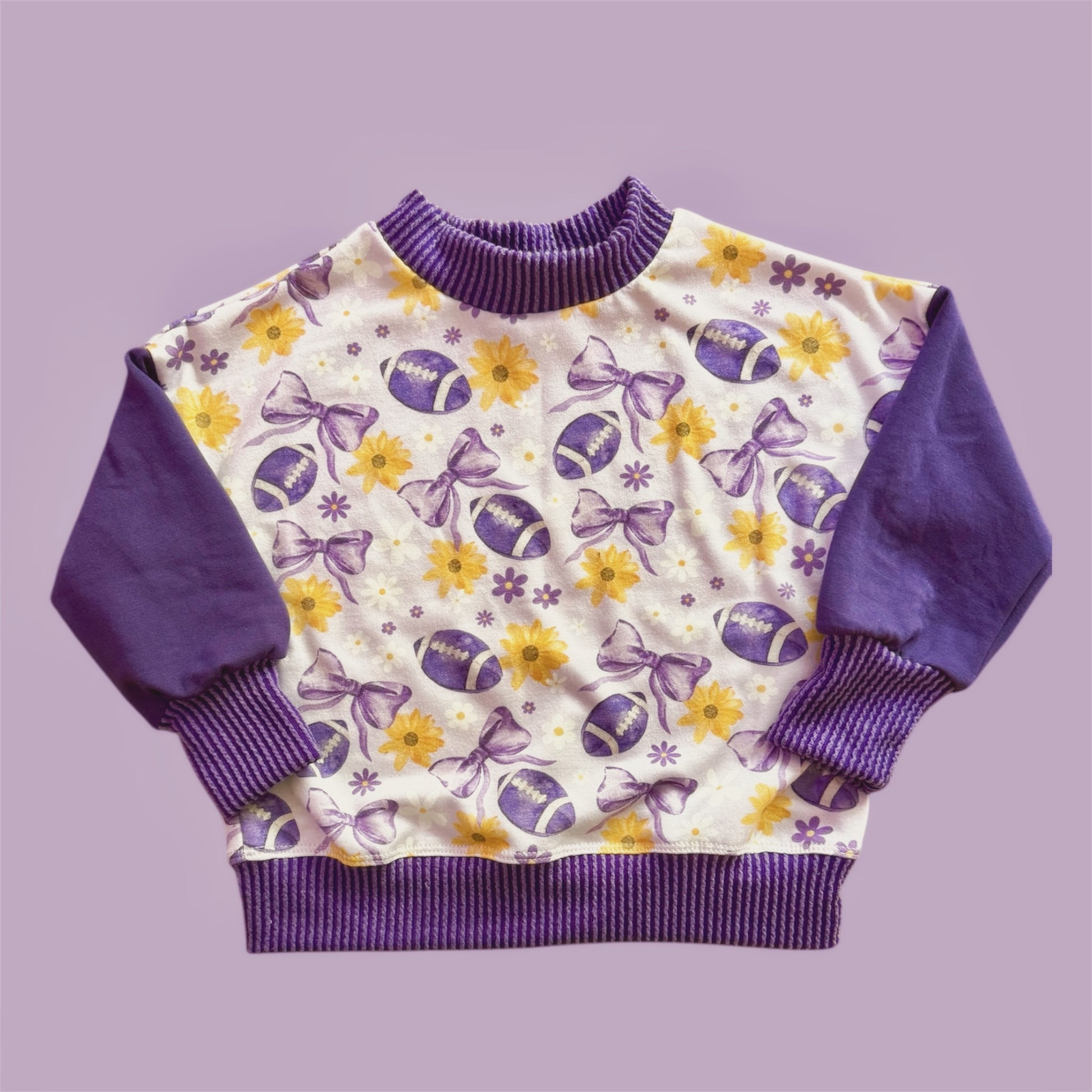 Stay warm and stylish with this unique Mock Neck Oversized Grow with Me Vikings with Bows Sweatshirt. Made with custom fabric featuring Bows and footballs, the mock neck adds a touch of flare. Its slouchy shoulder and oversized fit allows it to grow with your child as they do. Perfect for any little Viking fan!